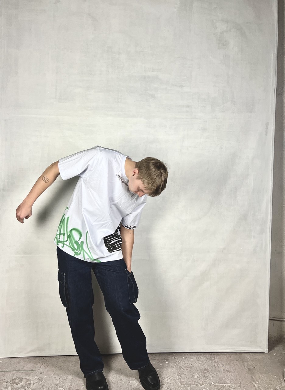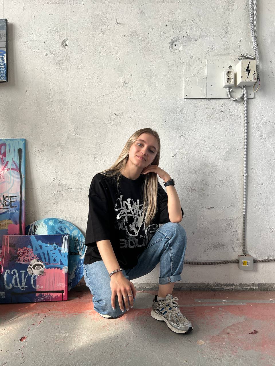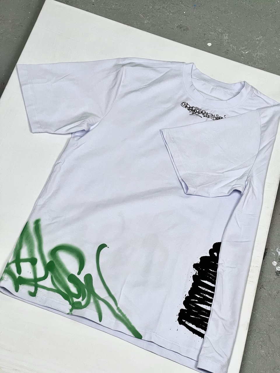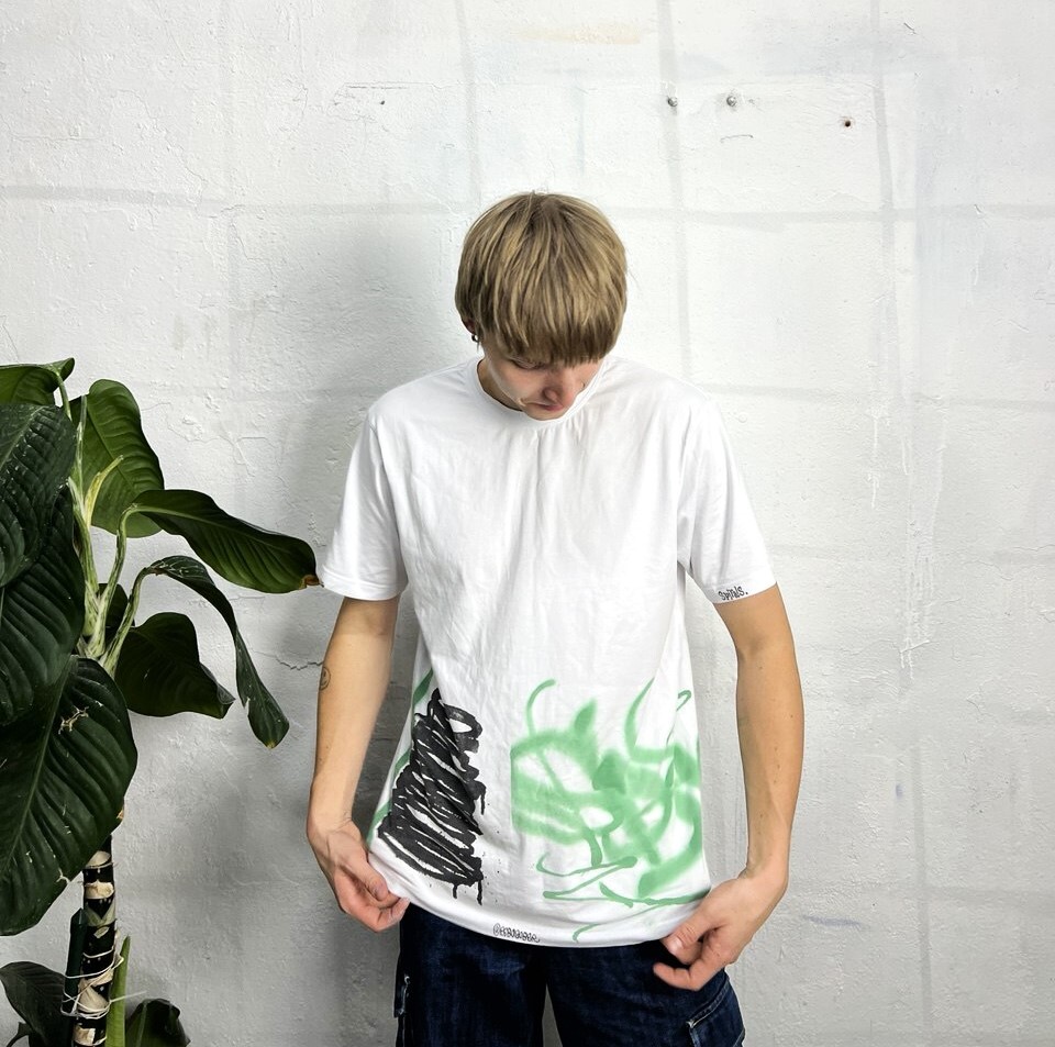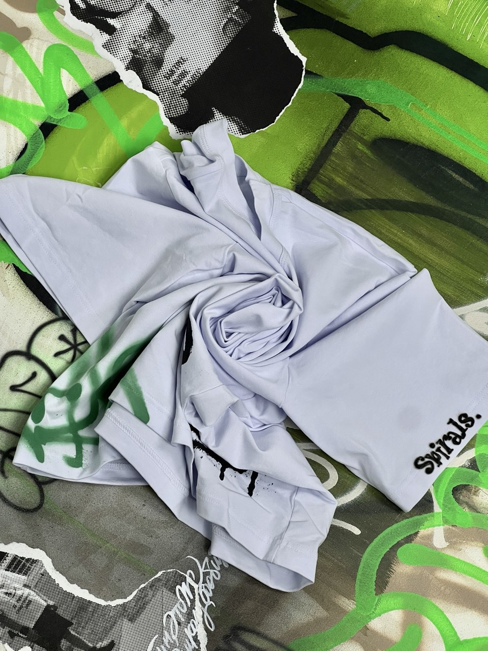 Те самые спирали, которые вы видели на всех картинах, на каждом рисунке - они воплотились в физический предмет и теперь украшают эту футболку. Символ, который узнаётся среди остальных. Все тэги сделаны специальными баллонами* по ткани, а мелкие надписи - маркерами по ткани. Сама спираль нанесена методом шелкографии - тоже моими руками:) Каждая футболка - уникальный арт объект