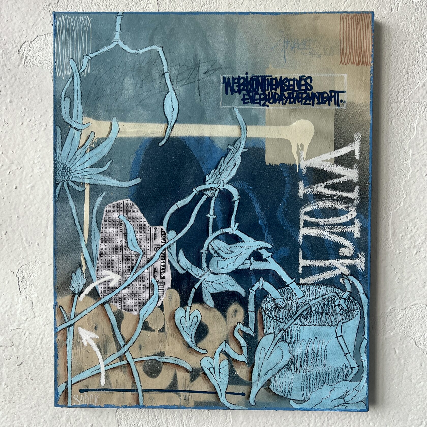 40x50, аэрозоль, масляные мелки, акрил, хлопковый холст на деревянном подрамнике, печать на бумаге